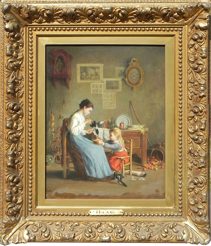 An antique painting in a gold ornate frame enriching the age and time period of the artwork.