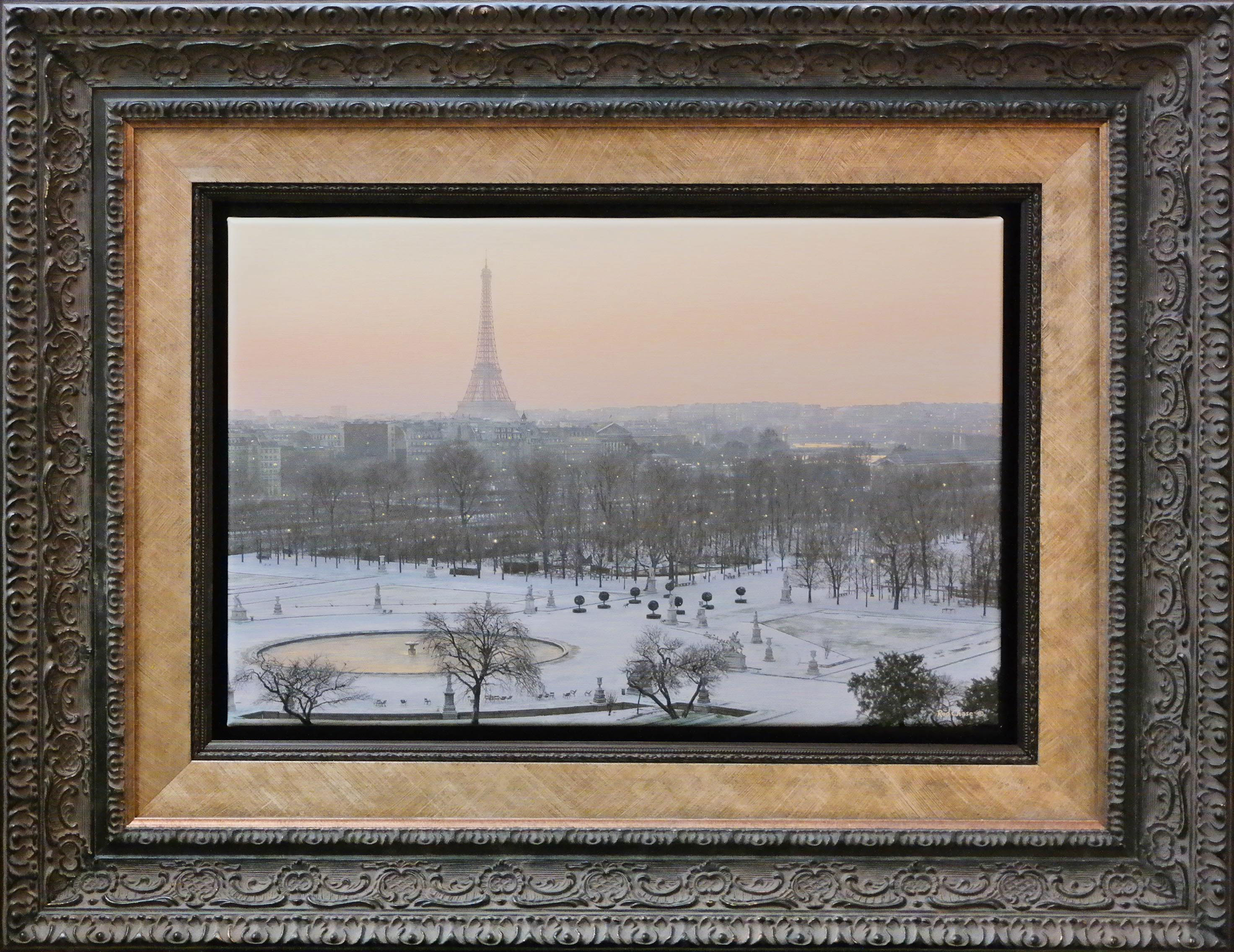 A Paris scene painting by artist, Rod Chase, floating within a double layer frame.