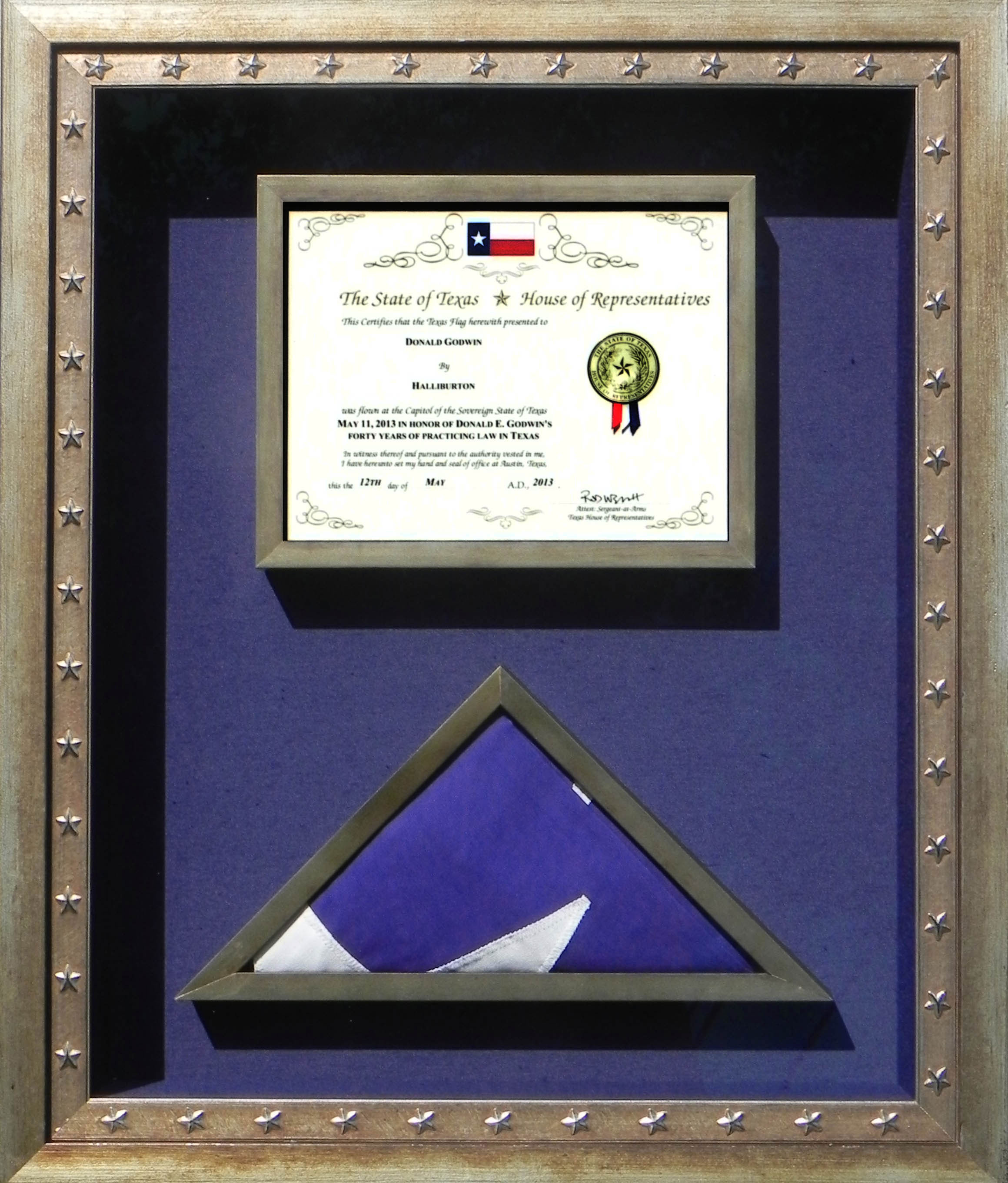 A perfectly folded Texas flag in a frame that represents the southern pride.