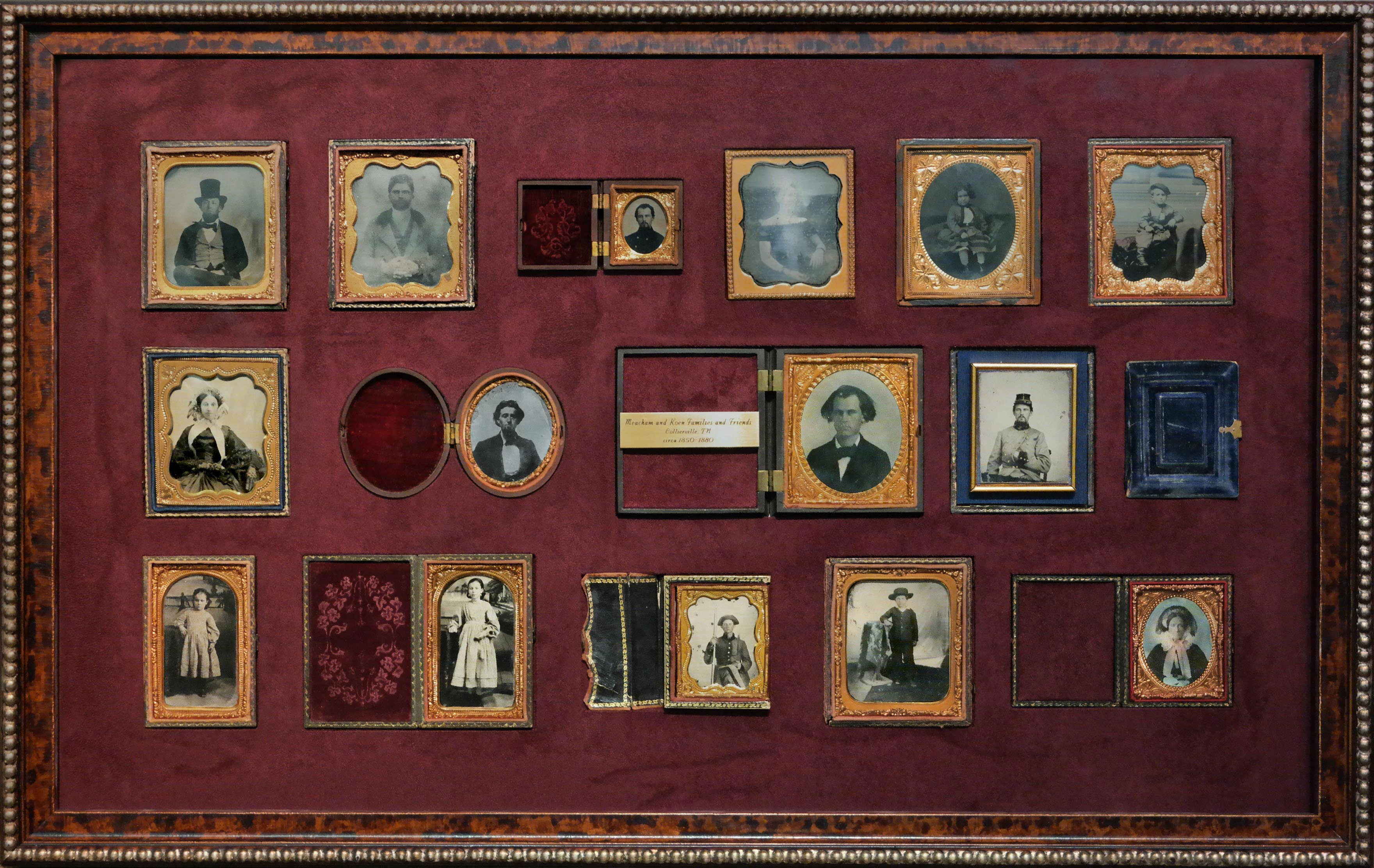 A grouping of family tin types collected and kept safe over the years. This framing is so unique, that the back is actually glass so that all the details of the tin types are showing. The burl frame reflects the age and the refinement of the family images.