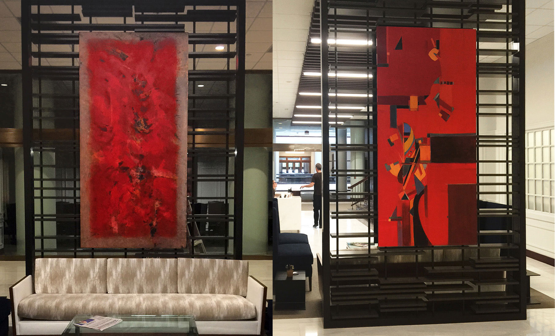 This corporate office thought outside the box. Commissioning two different artist to paint the same size and color scheme gave this lobby unique style!