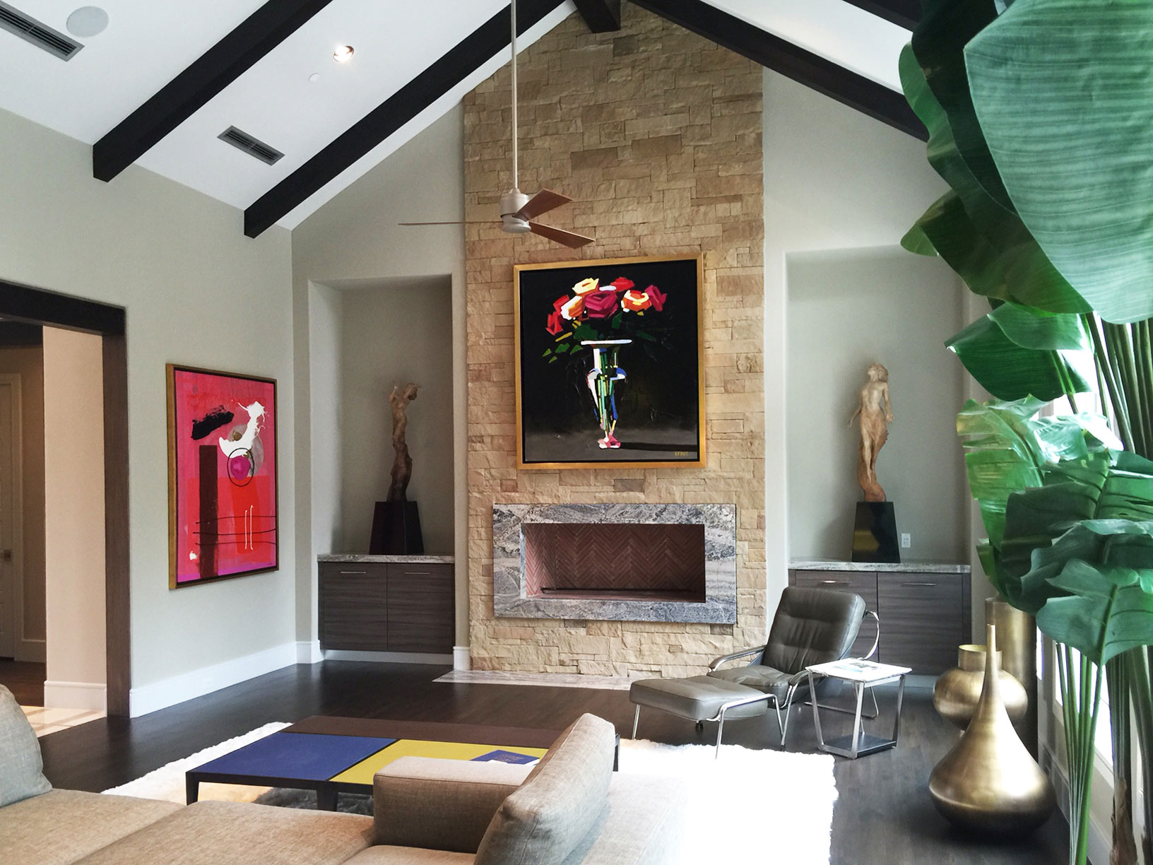 In this space the client has mixed traditional with contemporary. The two paintings are by Harold Kraus and Sculptures by Martin Eichinger.