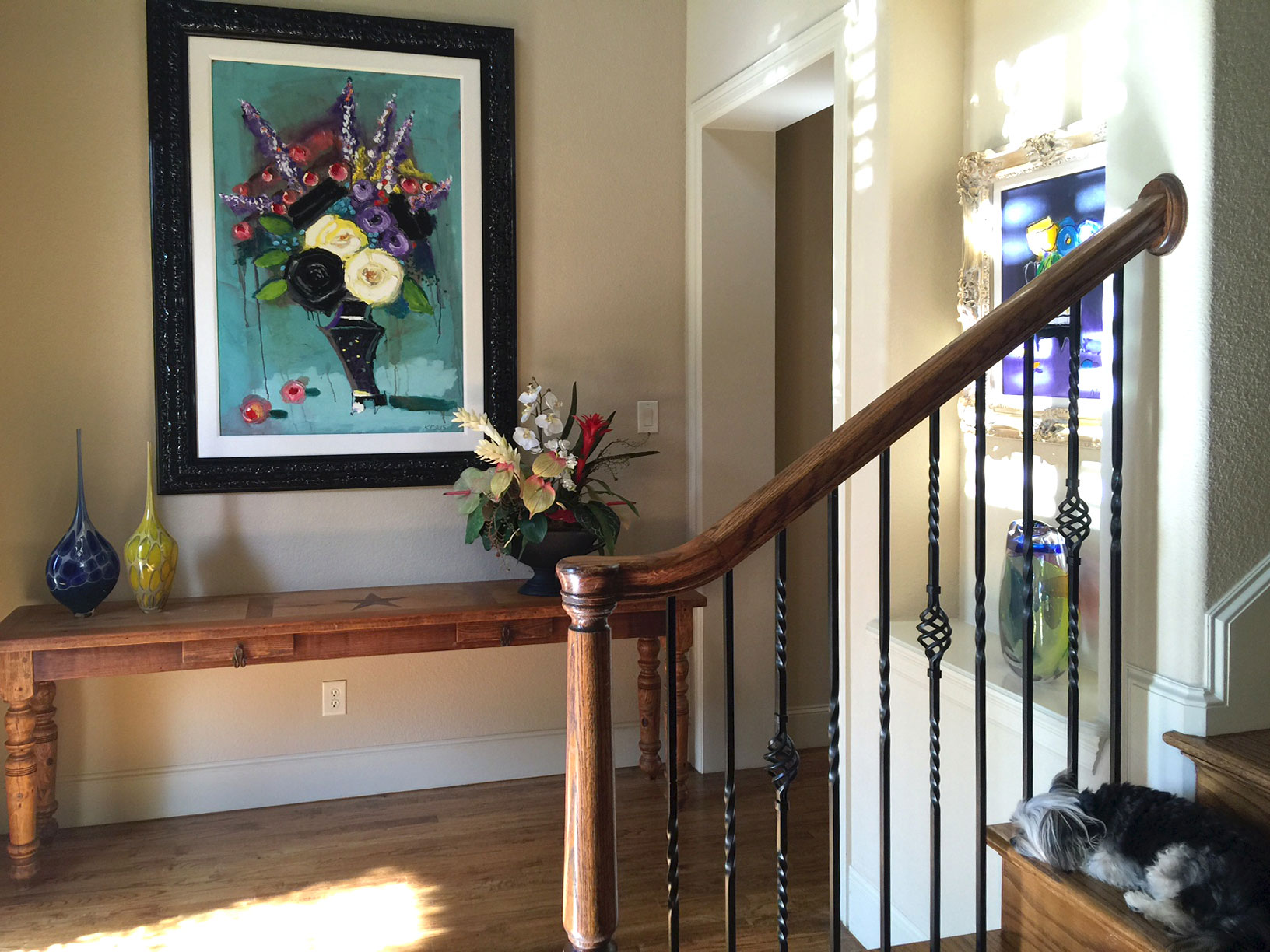 An entryway sets the mood to the entire house. Paintings are by Harold Kraus and glass vases from Kittrell/Riffkind Art Glass.