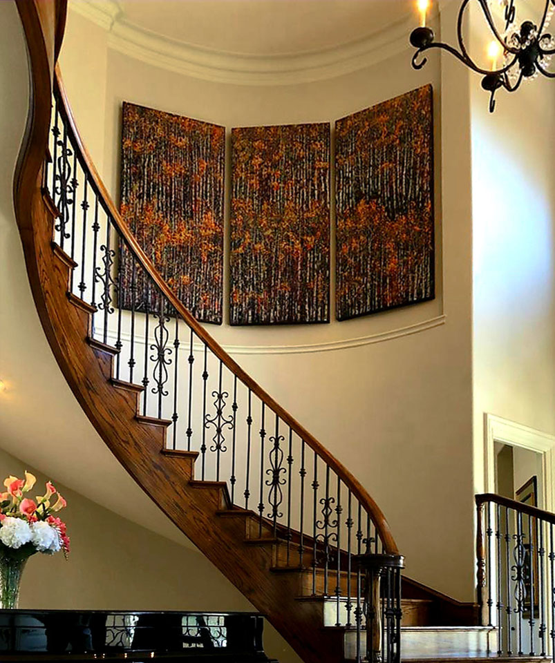 Art can fit in any space. The use of this triptych on a rounded wall added dimension and color to this stairway.