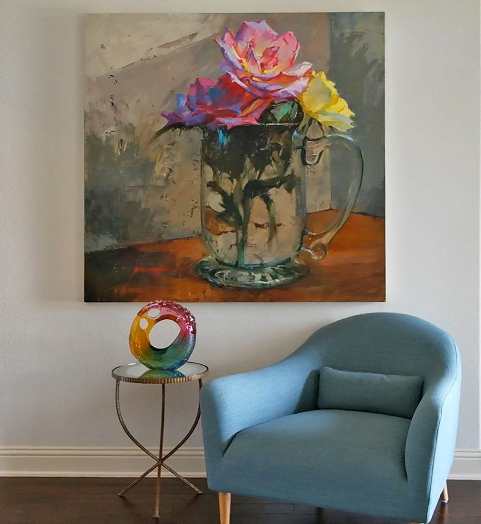 This vignette utilizes the space with color. The painting featured is by John Cook and the glass sculpture is from Kittrell/Riffkind art glass.