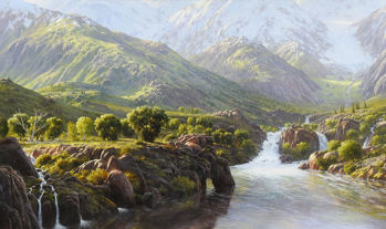 "Mountain Valley with Waterfall"